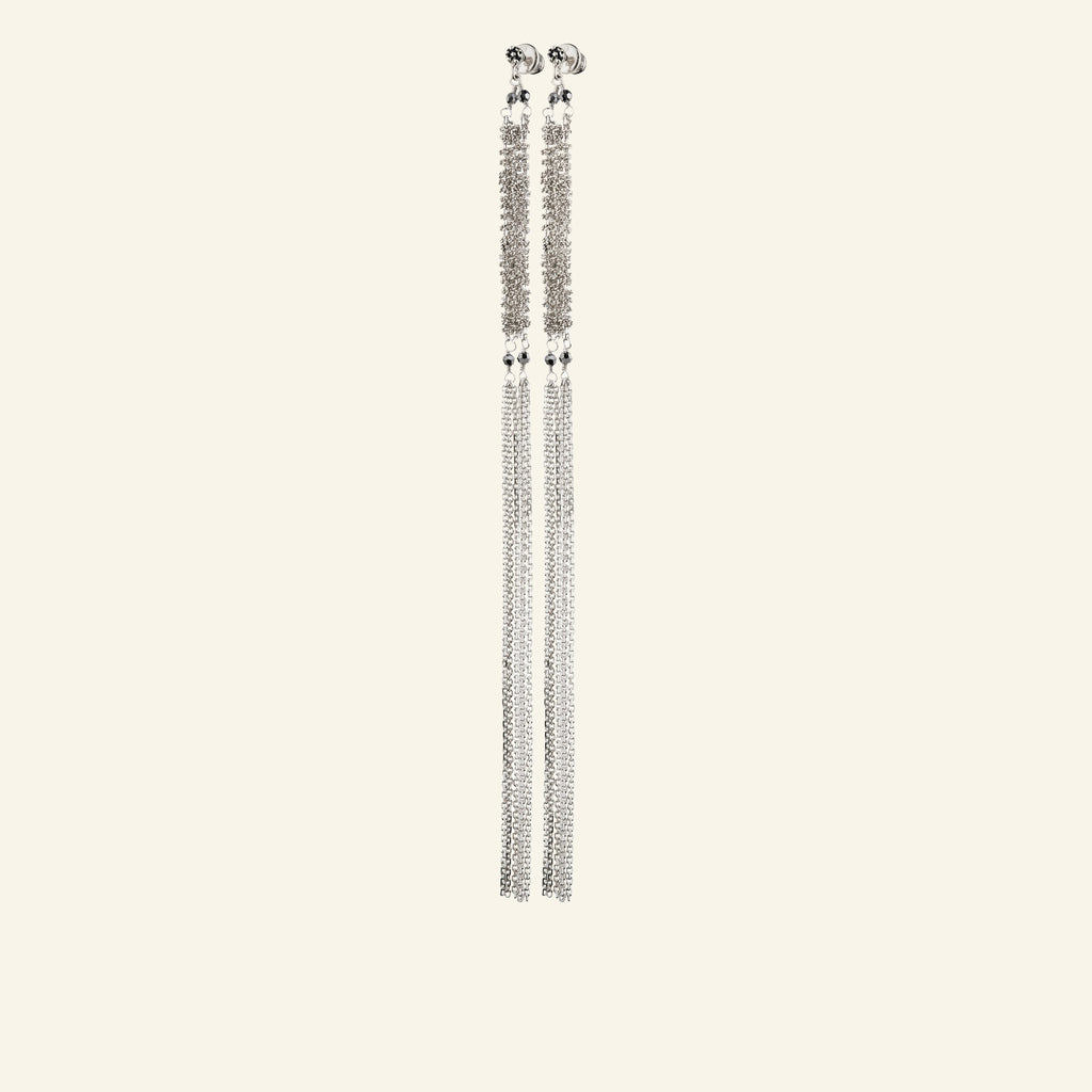 Pair of woven sterling silver earrings made of forçat chains finished with crystal beads and multi-strand chains tassels.