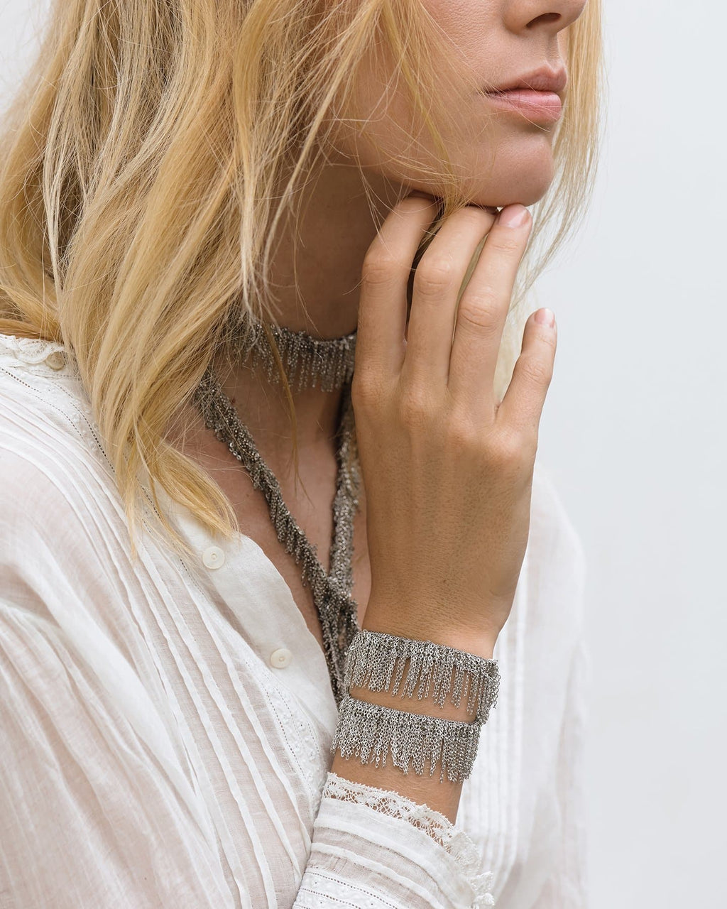 Double wrap bracelet embroidered on a light grey metallic ribbon with multi-strand chain fringe and two snaps for closure.