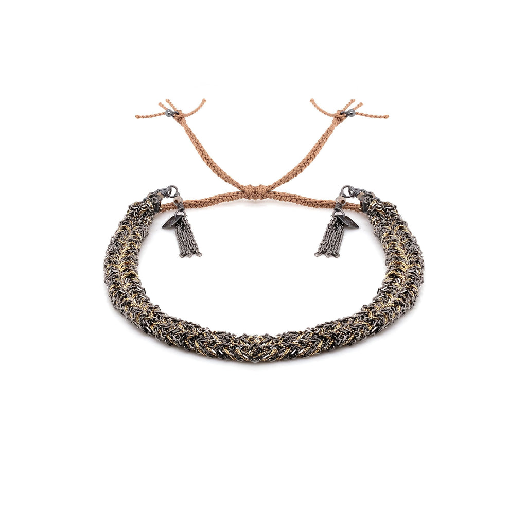 Our iconic hand-braided bracelet with forçat Sterling silver chains and twisted gold color lurex yarn finished by little chain fringe and tiny crystal beads. All parts are dipped in ruthenium.
