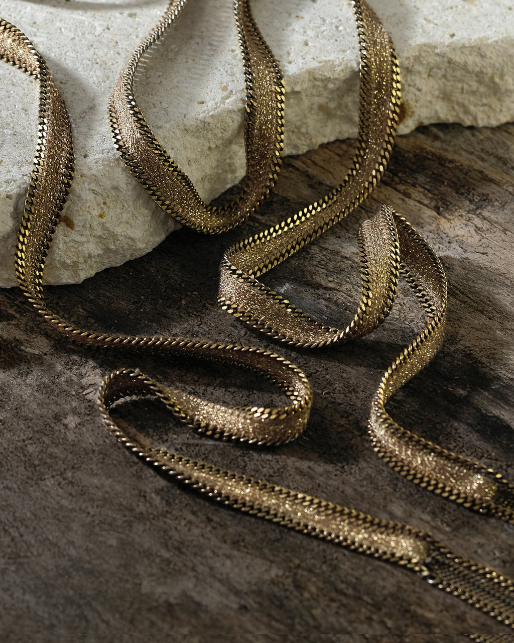Long scarf necklace made from a champagne-colored metallic satin ribbon, finely embroidered with brass chains in an antique gold finish. Chain tassels at each end complete the elegant design of the necklace that can be knotted at the front or wrapped around the neck.