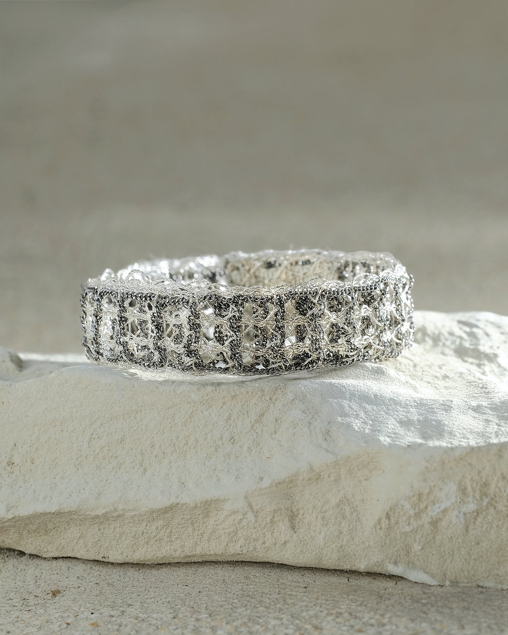 Double-wrap bracelet crafted from an antique silver Lurex lace ribbon, delicately embroidered with brass chains in a ruthenium finish.