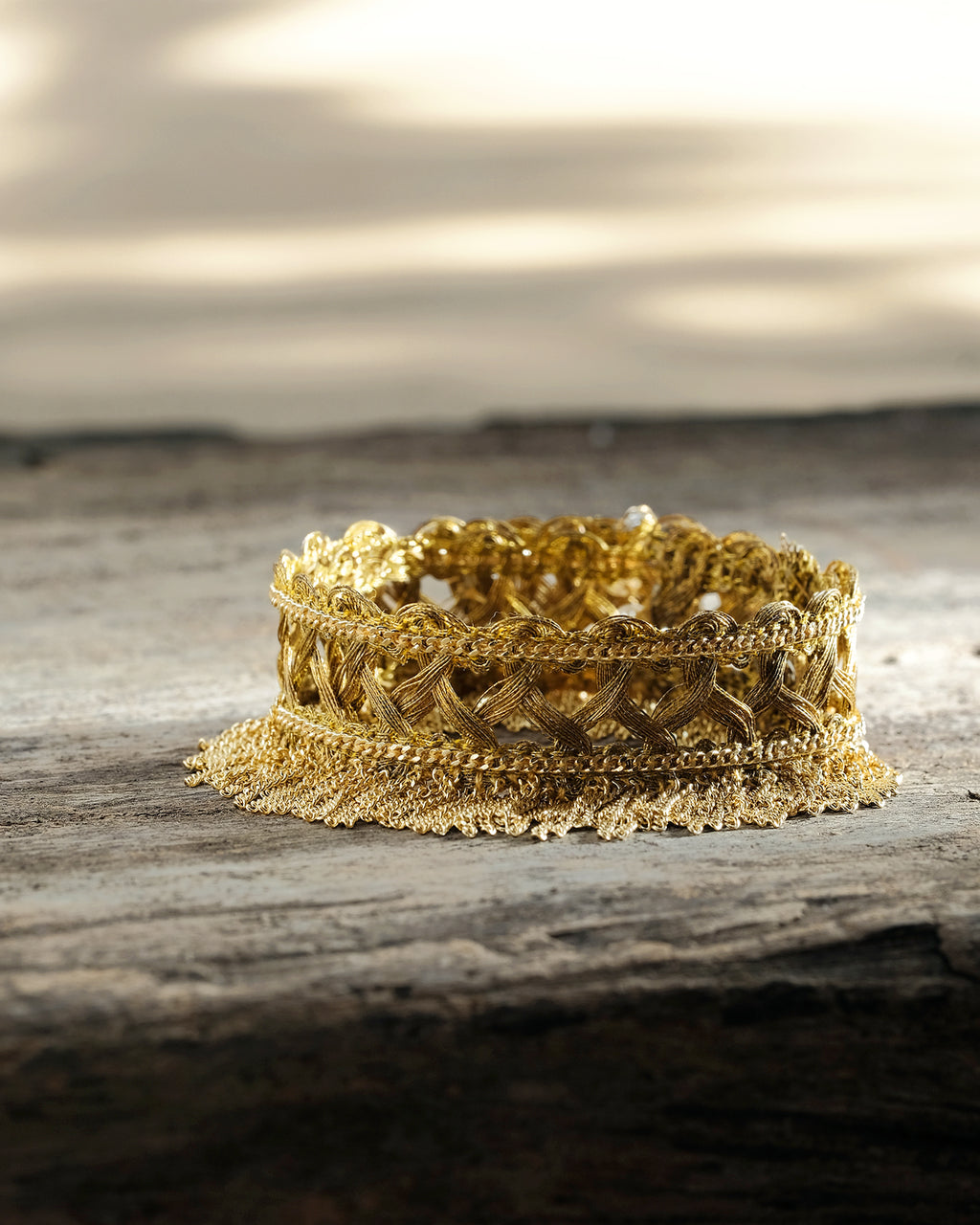 Double-wrap bracelet crafted from an antique openwork ribbon in gold Lurex, delicately embroidered with brass chains in a white bronze finish. A fringe of refined chains completes the look of the bracelet, which can also be worn as a choker.