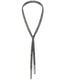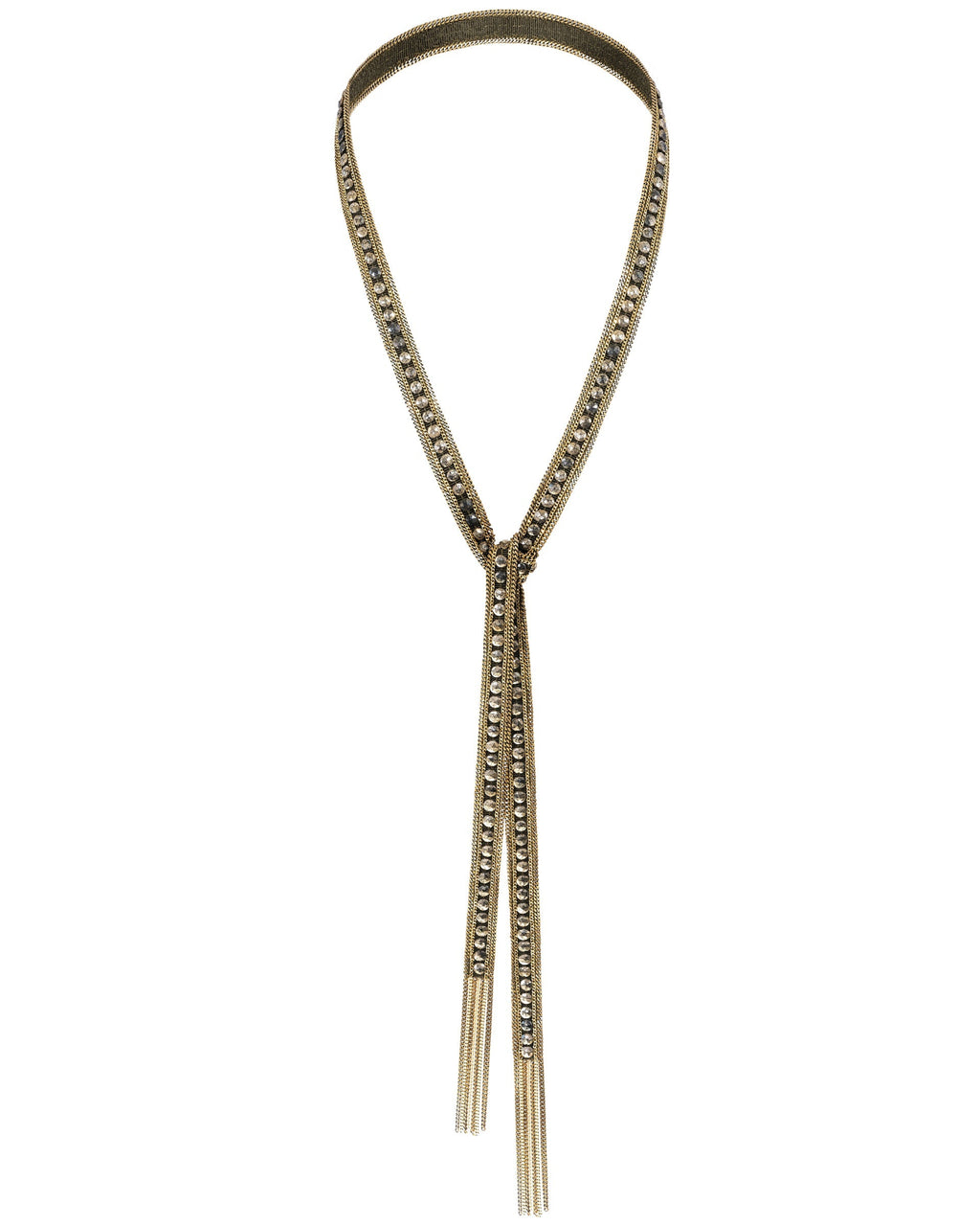Long scarf necklace crafted from a kaki grosgrain ribbon, delicately embroidered with brass chains in an antique gold finish. A row of vintage crystal beads with chromed reflection, along with chain tassels at each end, complete the elegant design of the necklace that can be knotted at the front or wrapped around the neck.