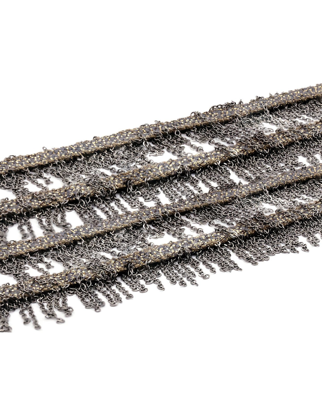 Lariat necklace embroidered on a soft dark grey metallic ribbon with chain fringe.