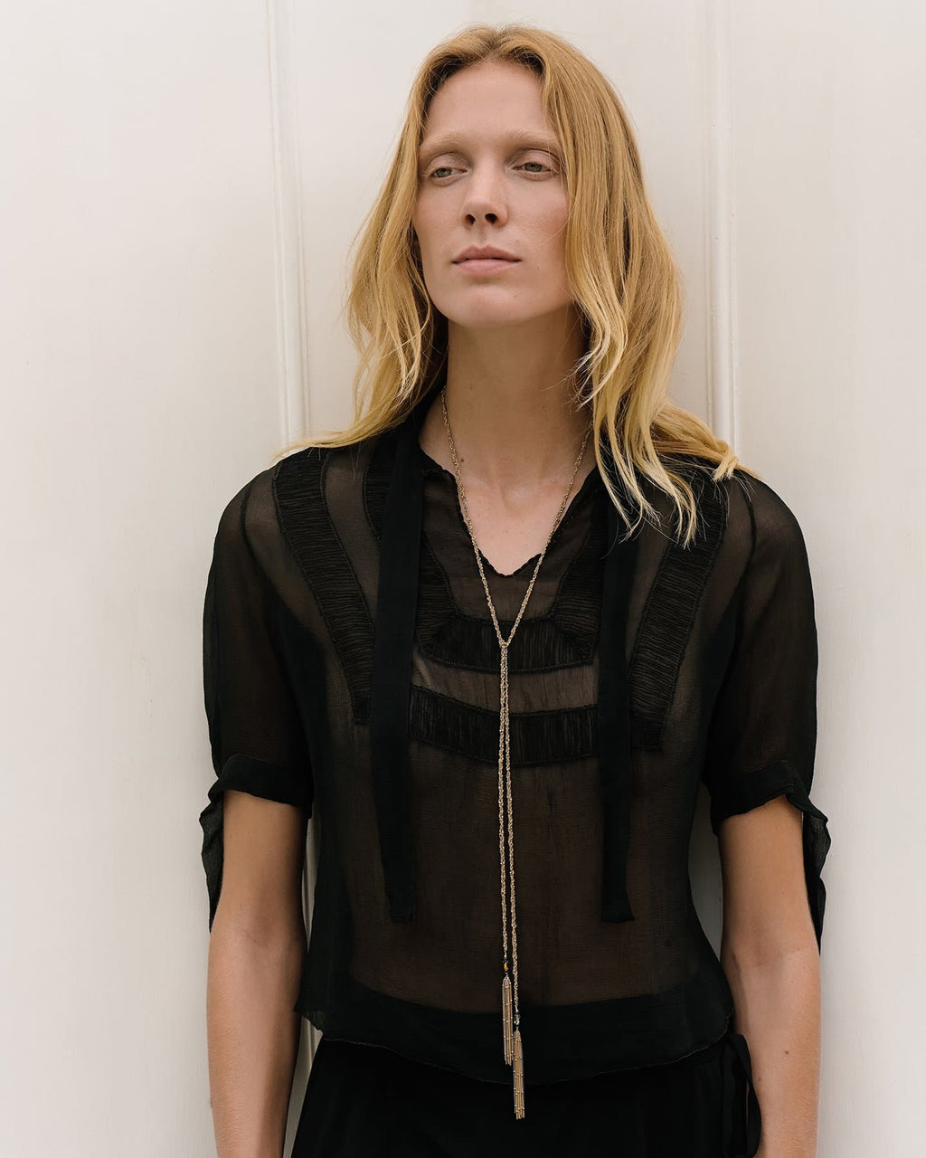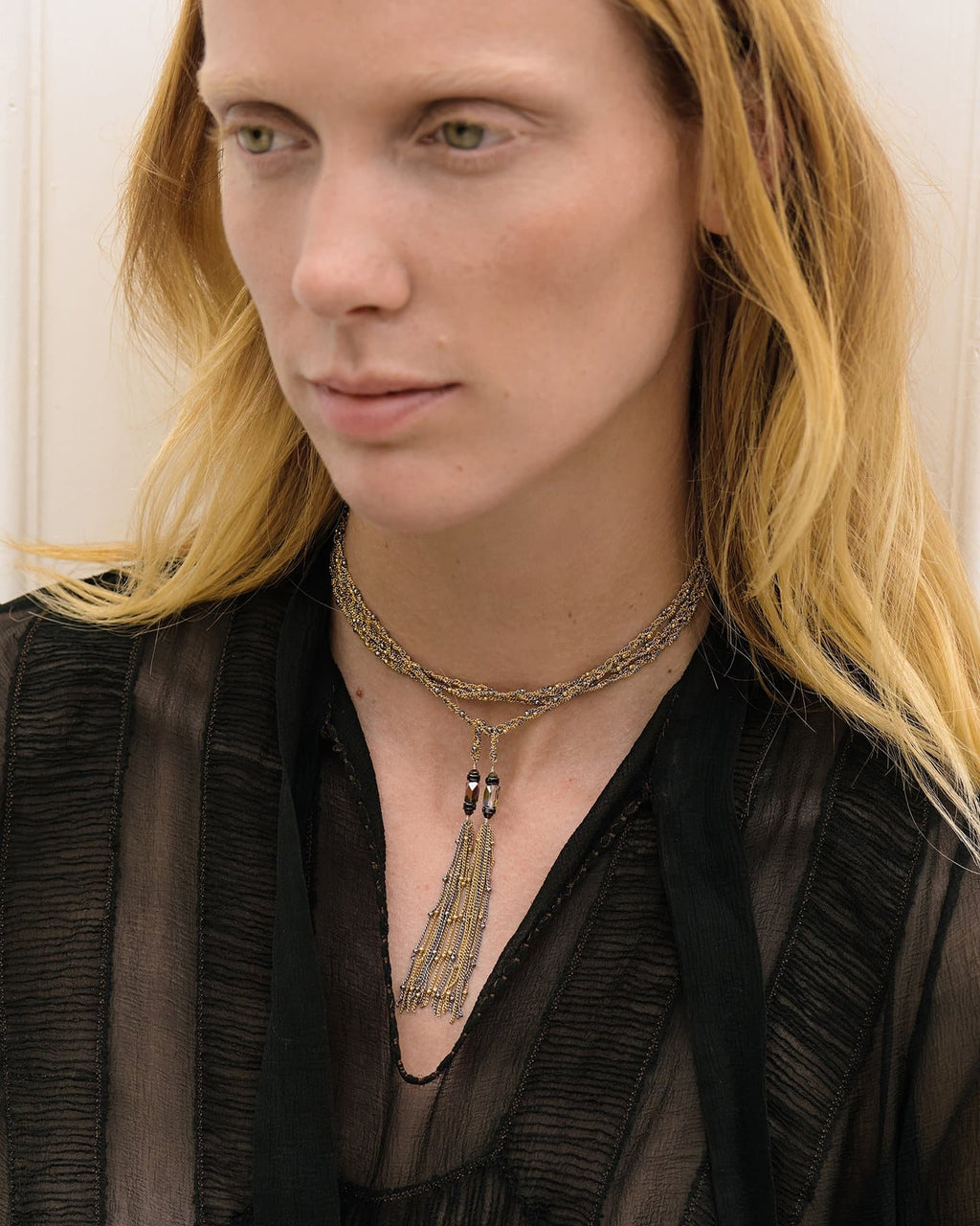 Tied as a simple scarf, wrap it twice around the neck, or adjust it shorter as a choker.