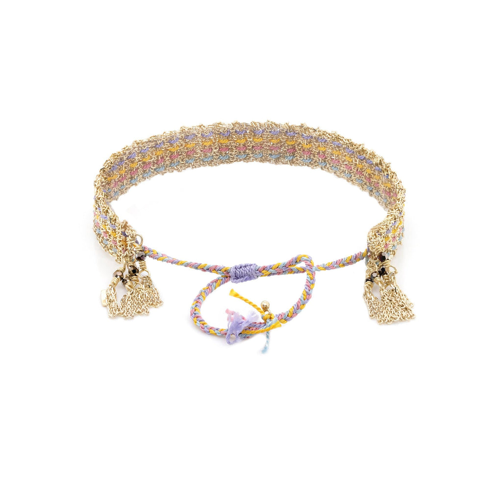 Multicolor woven bracelet made of sterling silver chain mixed with different silk color yarn.