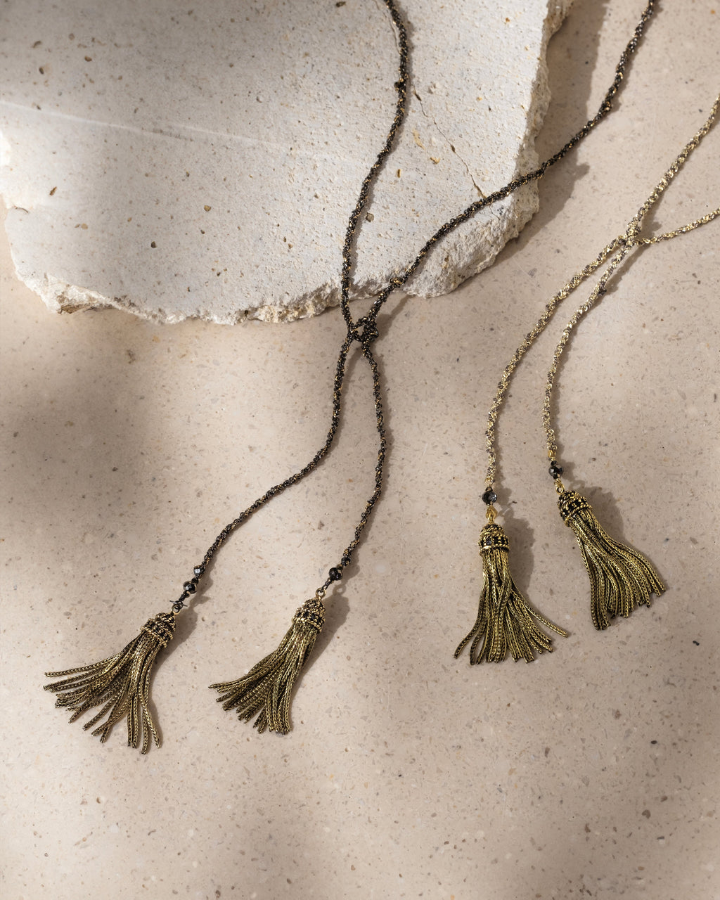 Braided open necklace with sterling silver chain and grey silk yarn to be tied or wrapped twice around the neck and two patina gold vintage tassels at both ends.