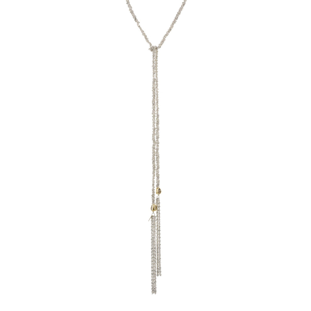 Lariat necklace in 925 Sterling silver with a rhodium finish, composed of a delicate braid of chains. Each end is adorned with a soft chain tassel and a faceted bead set with Polki diamonds.