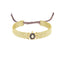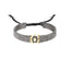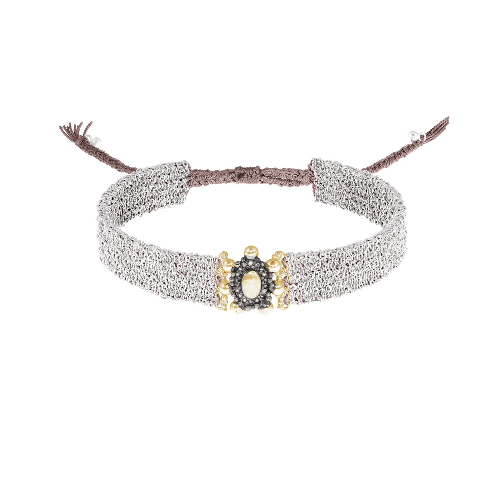 Woven bracelet in 925 Sterling silver with a rhodium finish, crafted from chains and grey silk yarns. It is adorned with a round medallion set with a solid silver stone, mini diamonds, and round motifs in gold and ruthenium finishes.