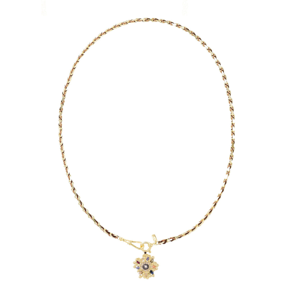 Necklace in 925 Sterling silver with a gold finish, featuring a wide-link chain, entirely hand-embroidered with brown and caramel silk yarns. It is adorned with a delicate removable pendant composed of Polki diamonds, multicolored Tourmaline beads and, handcrafted silver motifs.