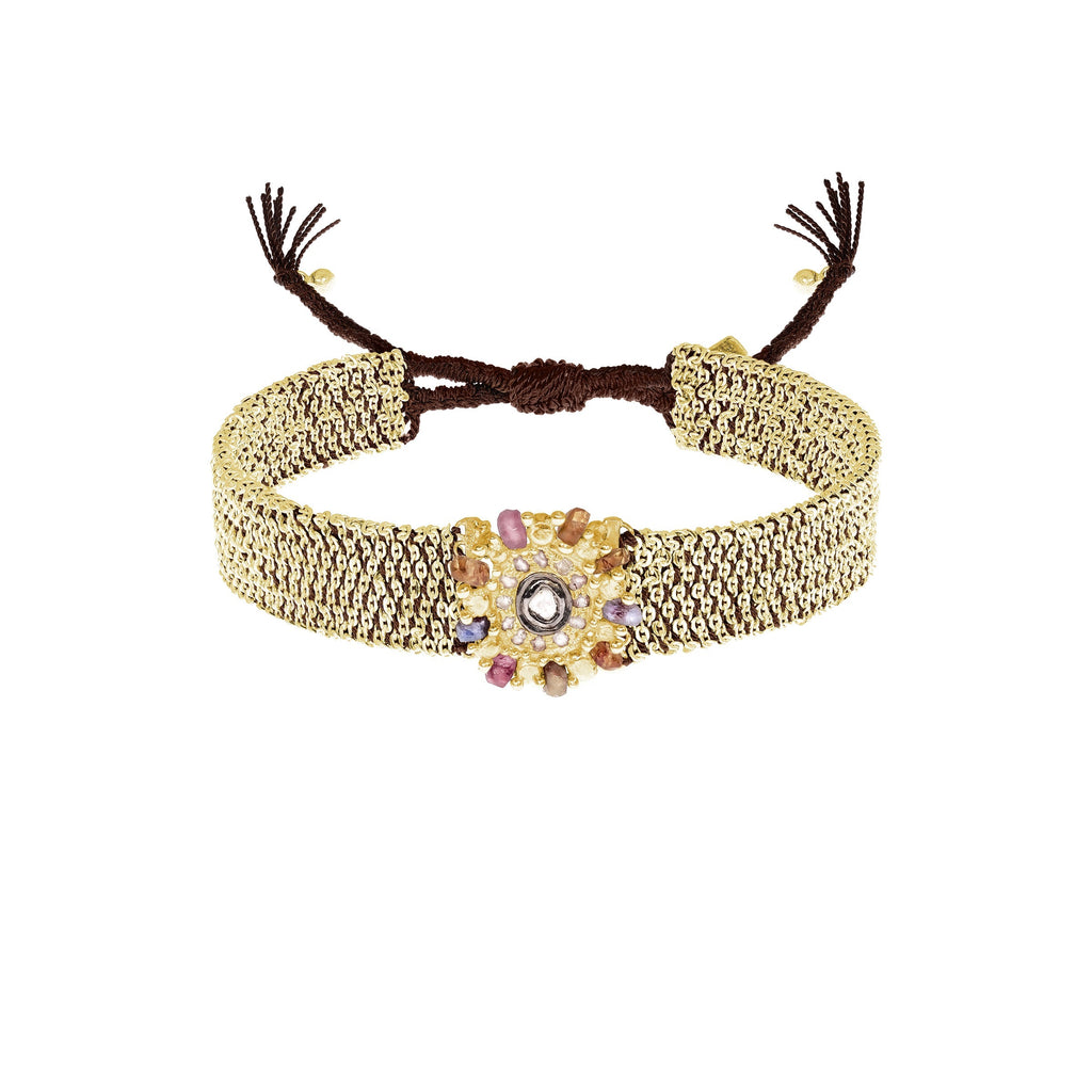 Woven bracelet in 925 Sterling silver with a gold finish, crafted from chains and brown silk yarns. It is adorned with a round medallion enhanced with Polki diamonds, multicolored Tourmaline beads, and finely crafted silver motifs.