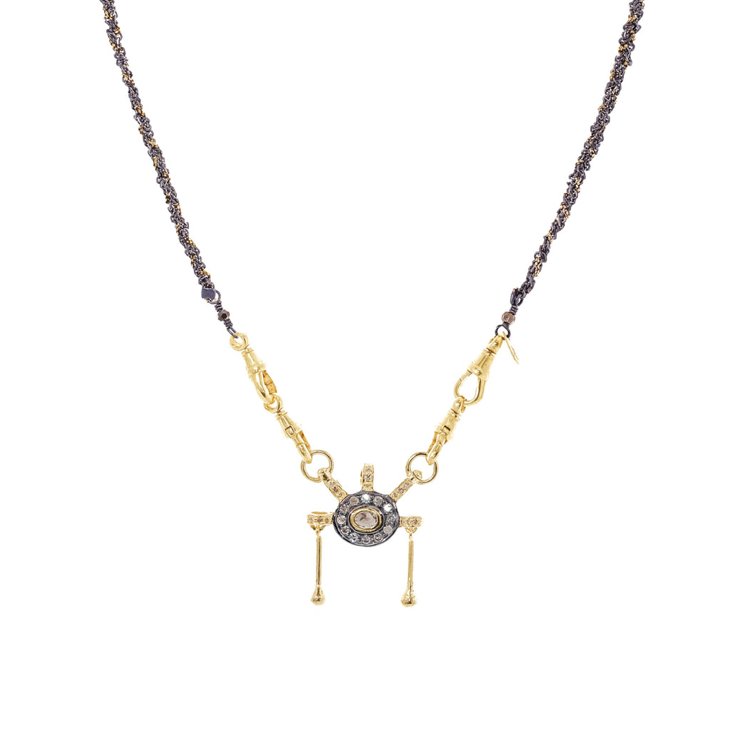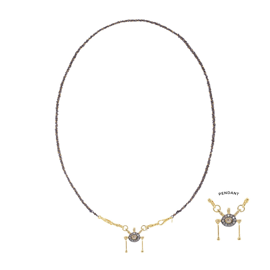 Necklace in 925 Sterling silver with a gold finish, composed of a braid of chains with a ruthenium finish and gold Lurex yarns. It features a removable pendant adorned with a Polki diamond, mini diamonds, and two articulated bars that bring movement to the pieces. The necklace fastens with four lobster clasps, ensuring a secure and elegant fit.