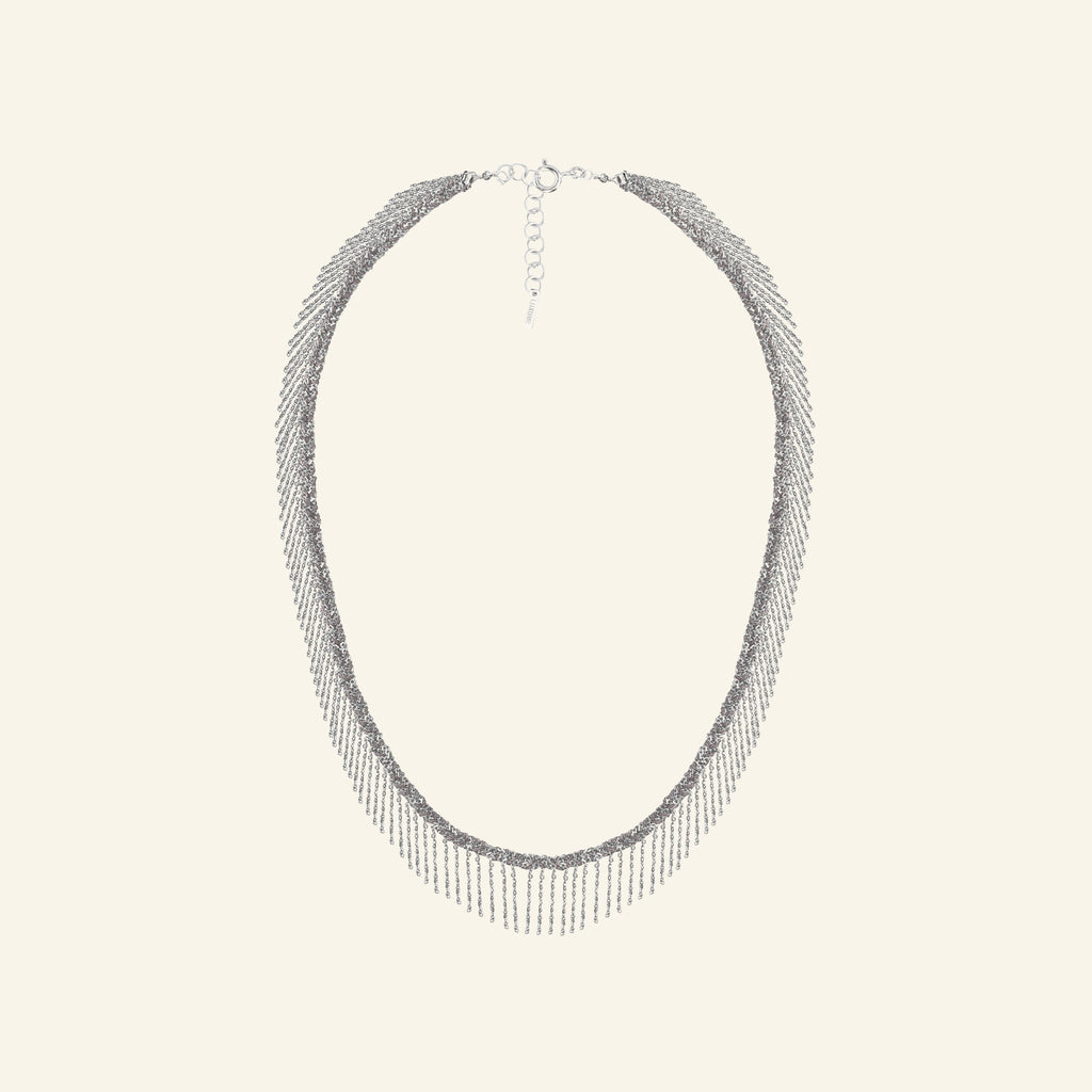 Short multi-strand fringe necklace in sterling silver chain braided with grey silk yarn.